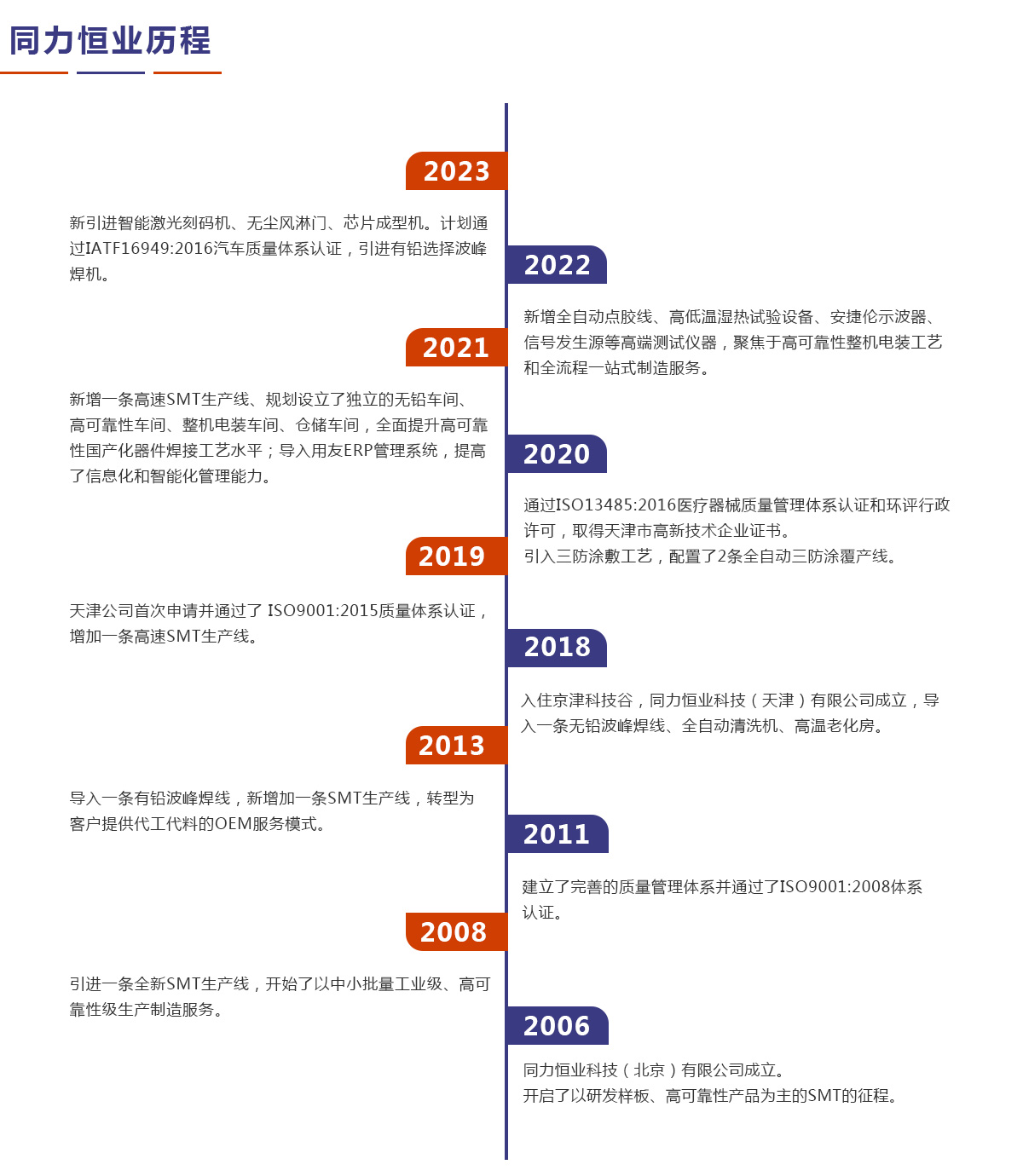 同力恒業(yè)科技成立于2006年,專業(yè)從事電子制造服務(EMS),專注于為客戶提供產(chǎn)品開發(fā)、工藝設計、物料配套、精密貼裝、插件焊接、三防涂敷、整機電裝、測試老化以及包裝運輸、售后維修等整個供應鏈解決方案。公司定位于高可靠性及中高端產(chǎn)品電子制造服務,在通訊導航、儀器儀表、醫(yī)療設備、汽車電子等領域具有豐富的一站式制造服務經(jīng)驗。